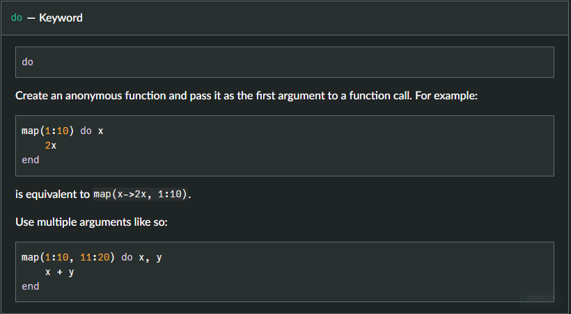 Maybe I am dense, but this took a while to click. Do syntax is used anywhere a function signature looks like: funcName(function, iterable). If you function takes a function as the first argument it likely makes use of the do syntax by moving the function argument into the do block for readability.