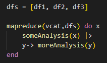 Lately I have found this handy when looking at productivity data. I'll do something like load in a bunch of job completion data on a per person basis where each row essentially is a person and a work order and some data about completion of the work order. It will also include the shop as a designation. I found that a nice reusable pattern is to group the data by shop and then collect those individual groupings as dataframes. I then map the dataframes to complete whatever analysis I want and if I need to combine them I use map reduce. I use vcat() as the reduction operator to vertically concatenate (i.e. append each new df to the running dataframe). It ends up conceptually like this: