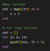 Mind you that here I have expanded map to its most verbose form and the for loop to its most concise. Map saves the need to create the container for the output or to push a value to that container. If we wanted to push this further you could use the parenthetical syntax and make the map call a very reasonable one liner.